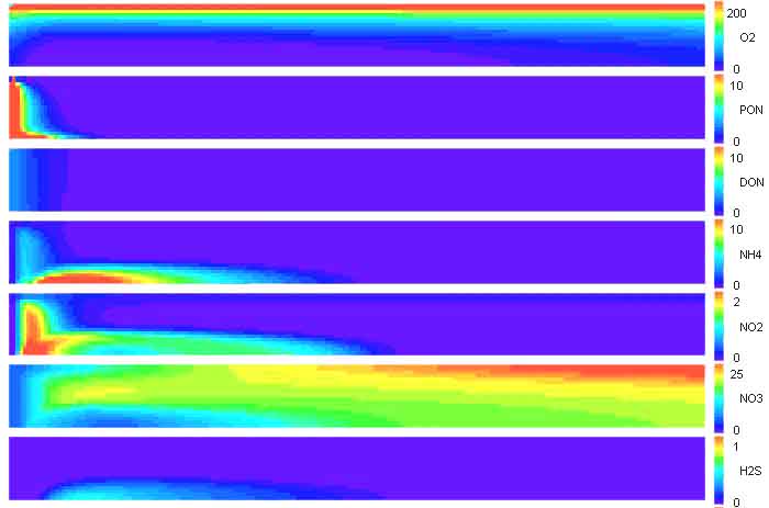 На представленном рисунке показано распределение на разрезе следующих параметров: кислорода (О2), взвешенного органического азота (PON), растворенного органического азота (DON), аммония (NH4), нитритов (NO3), нитратов (NO2) и сероводорода (H2S).