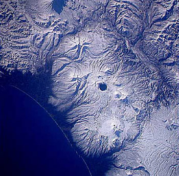 Камчатка, восточное побережье, вул. Карымский, в центре - озеро Карымское