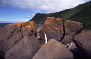 Валуны с лишайниками на морском берегу, Камчатка
