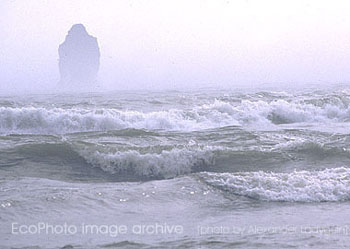 East coast of Kamchatka Peninsula, sea fog, storming sea, Rock "Guard" in a sea near by the shore
