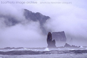 Comments: Kamchatka East coast, Bering sea coast, foggy day. Mist surronded the rocks. July 1999 Камчатка, туман во время шторма на побережье Берингова моря с кекурами